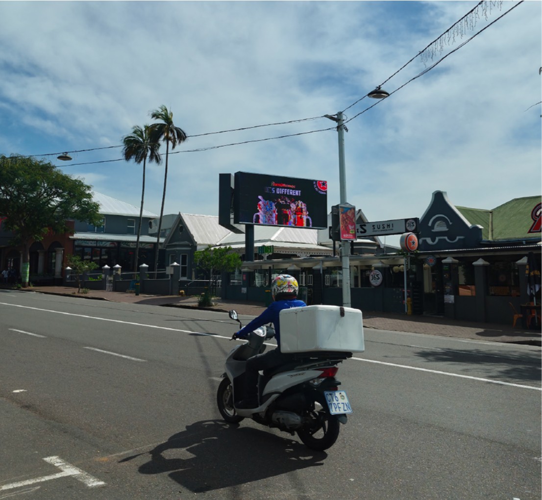DESCRIPTION : Situated at 120 Florida Road, Windermere, Durban. Strategically located on one of Durban’s busiest, most popular & trendiest streets. It is surrounded by a multitude of fast food restaurants, exclusive dining & entertainment outlets, as well as shopping centres. The site benefits from consistently high vehicle and foot traffic, with congestion during peak hours creating extended dwell times. Duration: 15 sec slot. Rotation: Every 3.75 minutes. Times: 5 am to 12 am. Plays: 17 000 per month