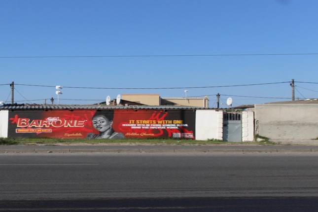 Wall Mural, Khayelitsha, Cape Town (3) SITE NUMBER : BB34-71 DESCRIPTION : Located near Pama Road intersection which a busy bus & taxi way that links different townships within Khayelitsha, close to Khayelitsha Stadium and a walking distance to Nonkqubela Shopping Centre. SIZE: 2m x 10m TRAFFIC : 500 000 Vehicles per month GPS CO-ORDINATES : -34.031111, 18.653778