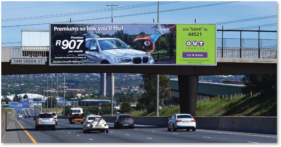 DESCRIPTION : Billboard situated on the Sam Green bridge crossing the N12 Highway. Traffic heading west towards Johannesburg and the Gillooly’s interchange on route to Sandton and Pretoria. NEARBY: O.R TAMBO INTERNATIONAL AIRPORT, GILLOOLY’S INTERCHANGE
