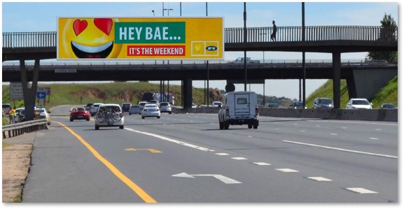 DESCRIPTION : Billboard situated on Watsonia Pedestrian bridge crossing the N3 Highway. Traffic heading north towards Johannesburg, Germiston and Alberton from the O.R Tambo International Airport, Pretoria, East Gate, Bedfordview. NEARBY: EASTGATE SHOPPING CENTRE, O.R TAMBO INTERNATIONAL AIRPORT, GILLOOLY’S INTERCHANGE
